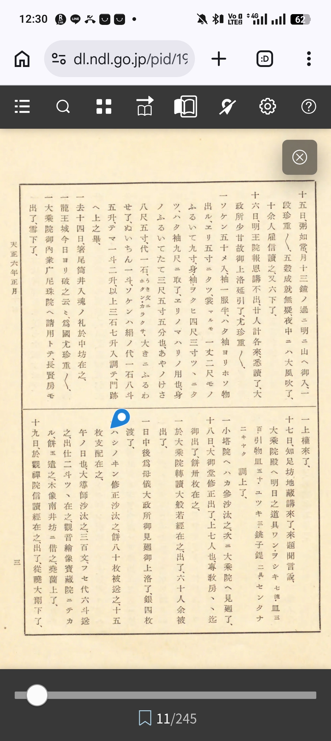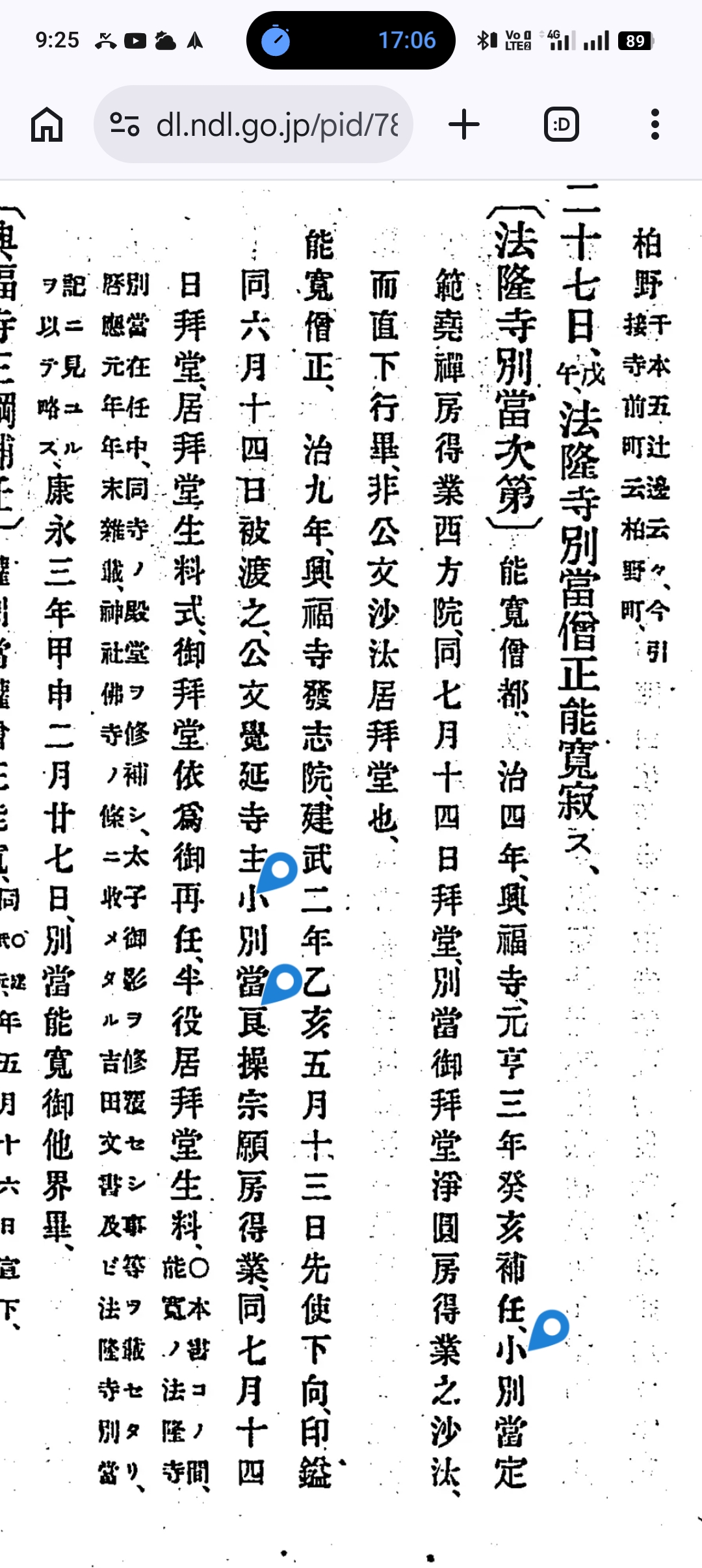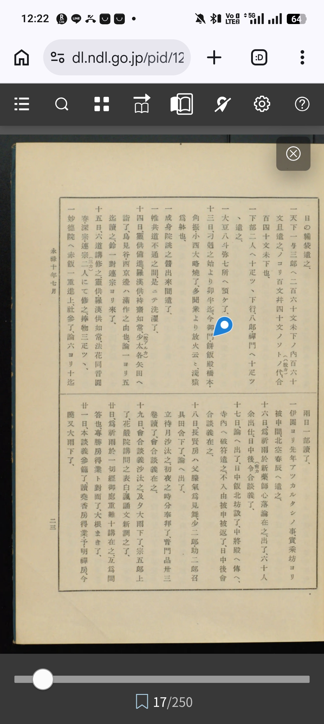 十七日、古迹談義參了、第七卷興基抄書始了、心經五百廿卷、都合也、十八日、當坊五師參賀沙汰了、日記二委細注之、一月待了、講問卅三座訖、源三郎上候間、成就院へ柳本庄入地可落之間申屆了、