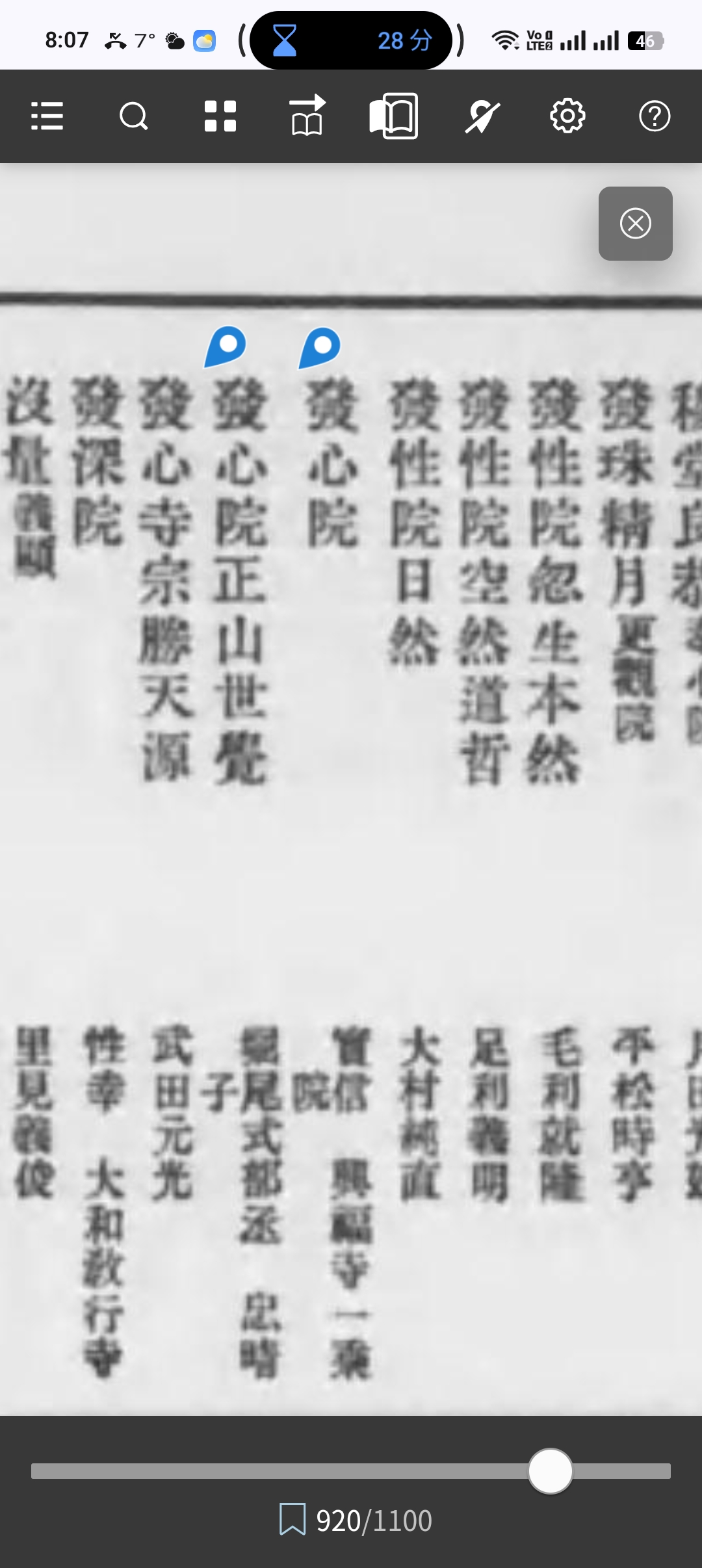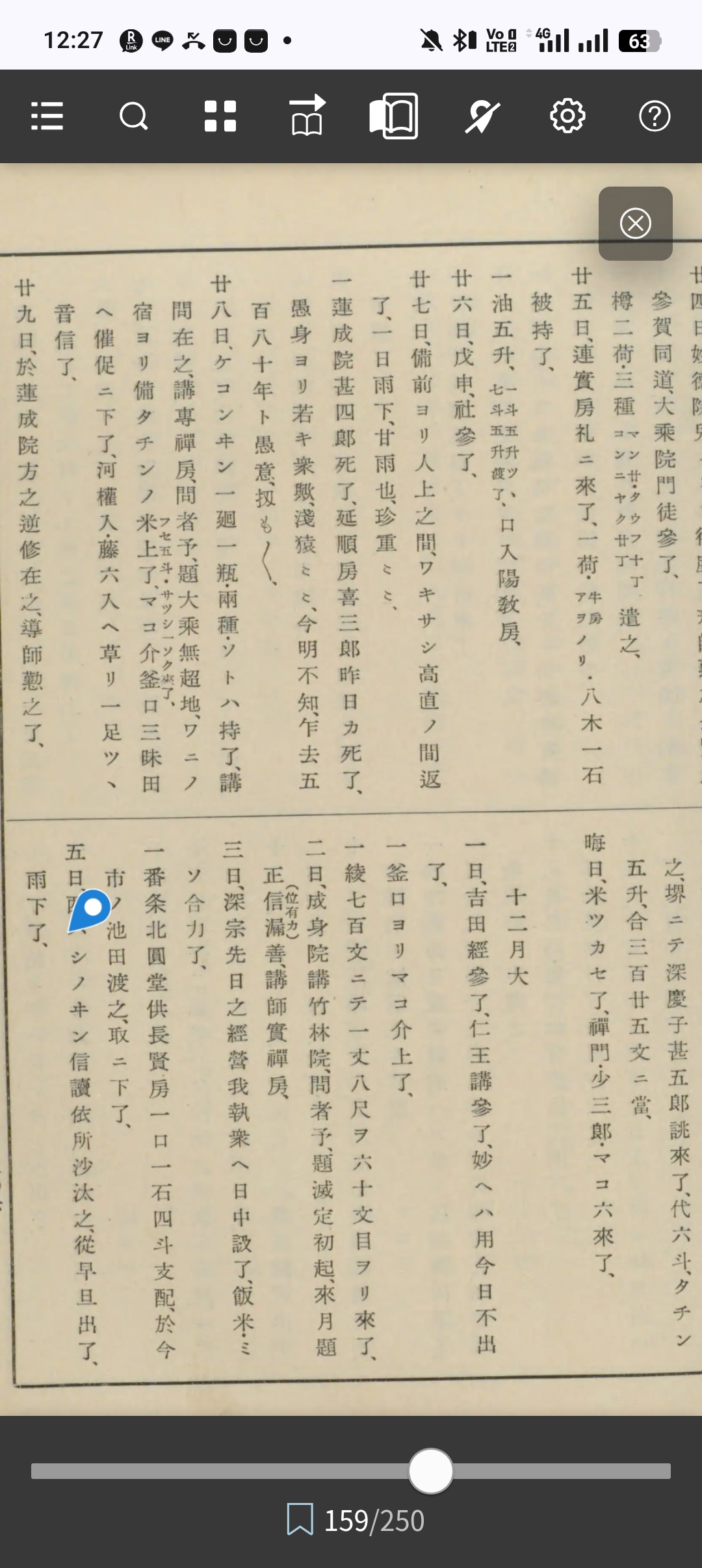 八日、論へ於中座出仕了、滿時塩斷了、一ノ坂藤菊方少袖仕合出來了、合二貫五百文程入了、柳本へノ六方ノ狀西發志院ニ謎了行學房舍利所望之間三粒出了、